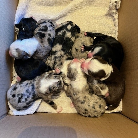 Aus der kompletten Farbpalette von Blue Merle, Red-Tri, Black-Bi und Black-Tri ist alles dabei.