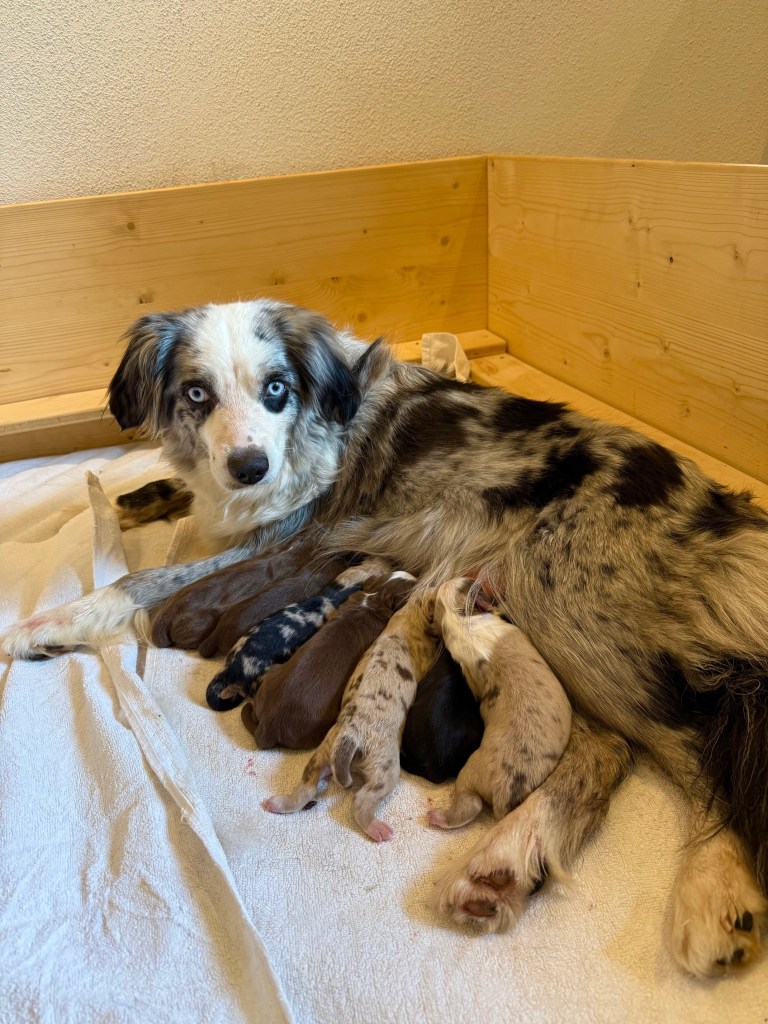 Am 09.04.2025 war es endlich so weit – unsere Miniature Australian Shepherd Welpen sind gesund und munter zur Welt gekommen! 💕 Unsere tapfere Hündin hat die Geburt großartig gemeistert, und wir könnten stolzer nicht sein.
