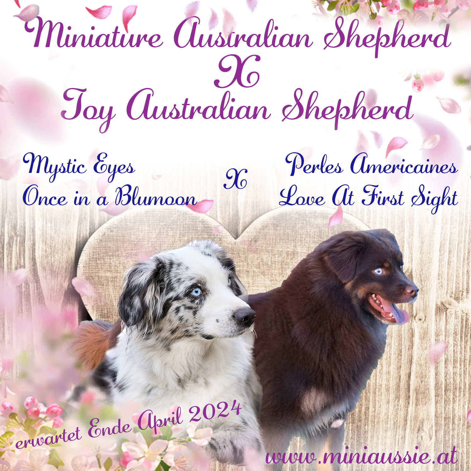 Wir freuen uns euch mitteilen zu dürfen, dass unsere Wunschpaarung mit unserer Mystic Eyes Once In a Blumoon und Perles Americaines Love At First Sight geklappt hat! Wir erwarten Ende April 2024 Mini Australian Shepherd x Toy Austrialian Shepherd Welpen 🙂