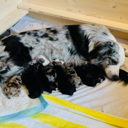 Am 27.03.2023 war es endlich soweit!Unsere Blu hat 8 wunderschöne Welpen geborgen.Von den Farben black-tri, black-bi, red-merle und blue-merle ist alles dabei. Ein gesunder, fröhlicher Haufen und wir sind unendlich glücklich dass alle fit und munter sind. Weitere Infos folgen 🙂
